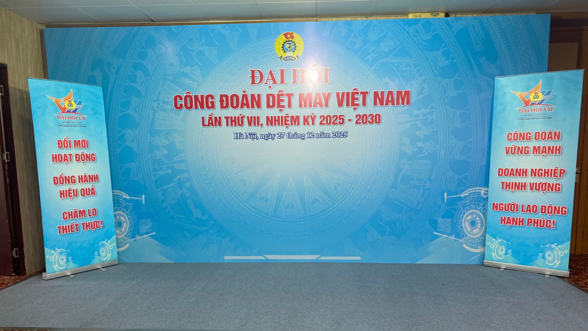 Nhận được sự tin tưởng từ Công đoàn Dệt may Việt Nam. H-Tech hân hạnh là đơn vị tổ chức trọn gói bao gồm thiết kế, in ấn, thi công thiết bị cho sự kiện.