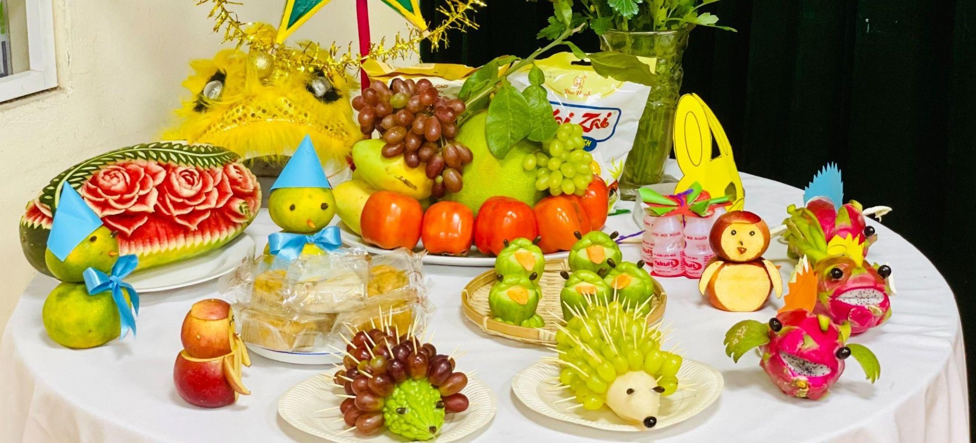Trang trí mâm ngũ quả bằng cách cắt tỉa trái cây có lẽ là cách được sử dụng nhiều nhất. Việc tạo hình thành những con vật rất thu hút các bạn nhỏ. Đây là cách làm tốn nhiều thời gian, đòi hỏi khéo léo nhưng kết quả nhận được lại thực sự rất độc đáo.